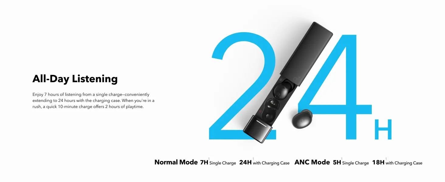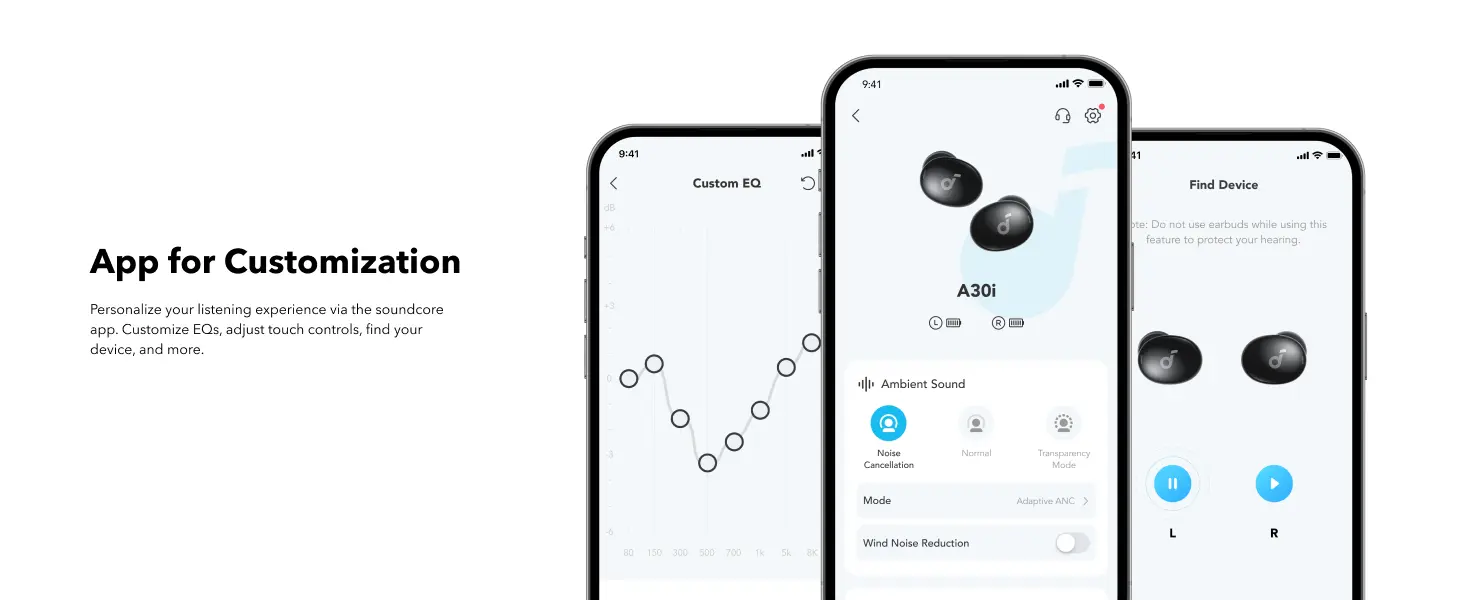 For audiophiles, the Soundcore A30i ensures clear, balanced sound with its composite diaphragm drivers. You can also take your music experience further by activating the 3D surround sound effect using the Soundcore app, providing a richer, more dynamic audio experience.