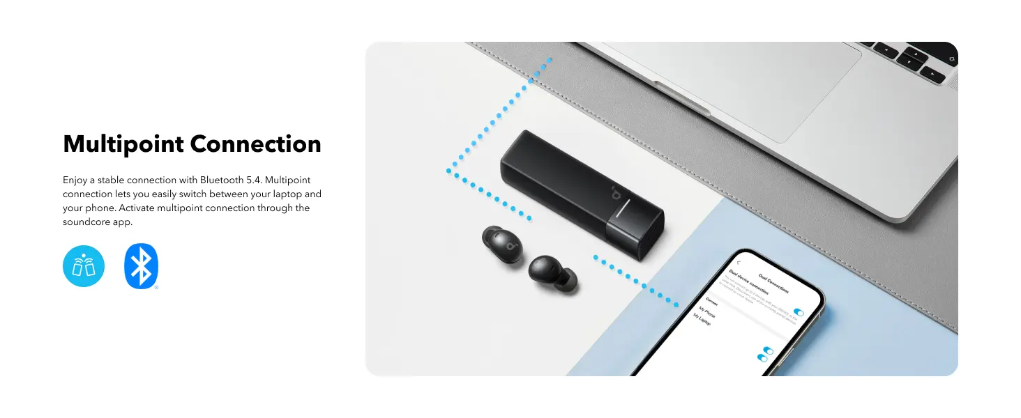 With Bluetooth 5.4 technology, multipoint connectivity, and the flexibility to use a single earbud when necessary, the Anker Soundcore A30i earbuds offer a reliable and hassle-free connection across devices. Switch between your laptop and phone effortlessly, and enjoy music or calls without missing a beat.