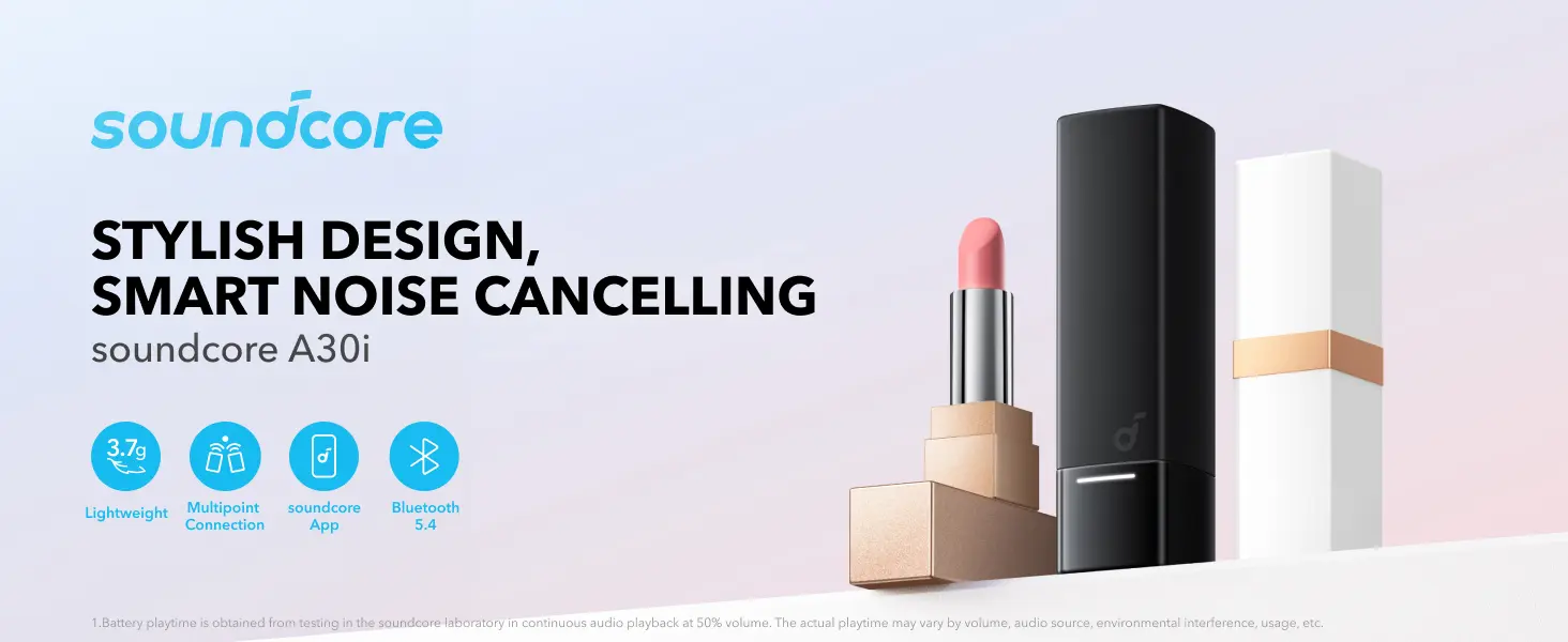 The Soundcore A30i Wireless Earbuds deliver a sleek, fashion-forward design in a compact lipstick-shaped case that’s both stylish and functional. These lightweight earbuds are ergonomically engineered for a comfortable, almost weightless fit, making them ideal for everyday use. Whether you’re commuting, exercising, or simply enjoying some downtime, the Soundcore A30i earbuds offer a seamless combination of comfort and convenience.